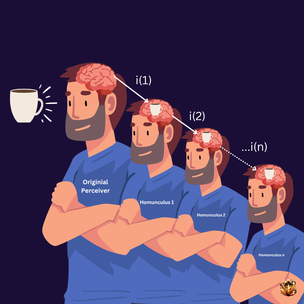 This informal fallacy is more popularly known as the ‘Homunculus Argument’, wherein a homunculus (perfectly formed miniature version) of yourself is present in your brain doing the work of conceptualisation. In turn, that homunculus has a homunculus of their own inside their brain doing the work of conceptualising for them, going into an infinite regressive loop, i.e., Original Perceiver -> Homunculus 1 -> Homunculus 2 -> … -> Homunculus n.